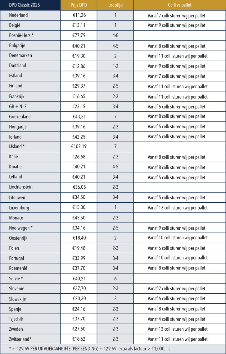 Dagelijks versturen wij door heel Europa, heel wat pakketjes met stoffen naar onze klanten. Met onze partner DPD, zorgen wij ervoor dat onze stoffen CO₂-neutraal de deur uitgaan. Bekijk hieronder het overzicht met de tarieven. De looptijd van DPD wordt berekend vanaf het moment van aanmelden van het transport. DPD doet er dan doorgaans x werkdagen (de looptijd) over om uw pakket te bezorgen.